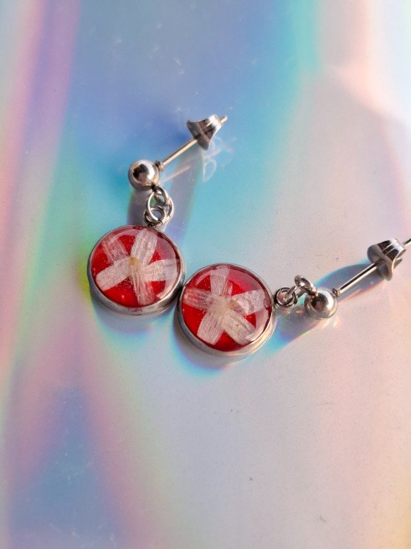Estos aros con pétalos de Margarita en un fondo rojo son una auténtica joya realizada en acero quirúrgico, e incluyen una bolsita para que te acompañen a donde vayas, aunque no los lleves puestos :)