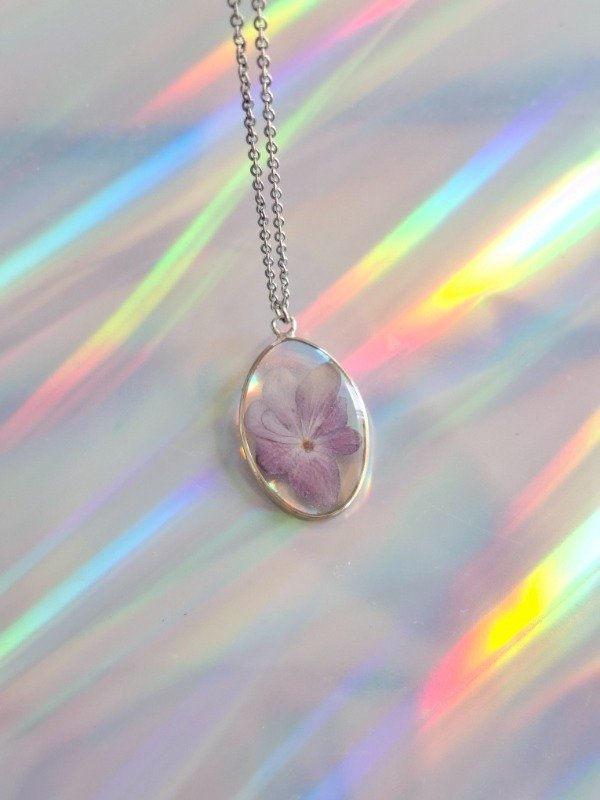 Este dije con una Hortensia lila es una auténtica joya realizada en alpaca, e incluye su cadena de acero quirúrgico y una bolsita para que te acompañe a donde vayas, aunque no lo lleves puesto :)