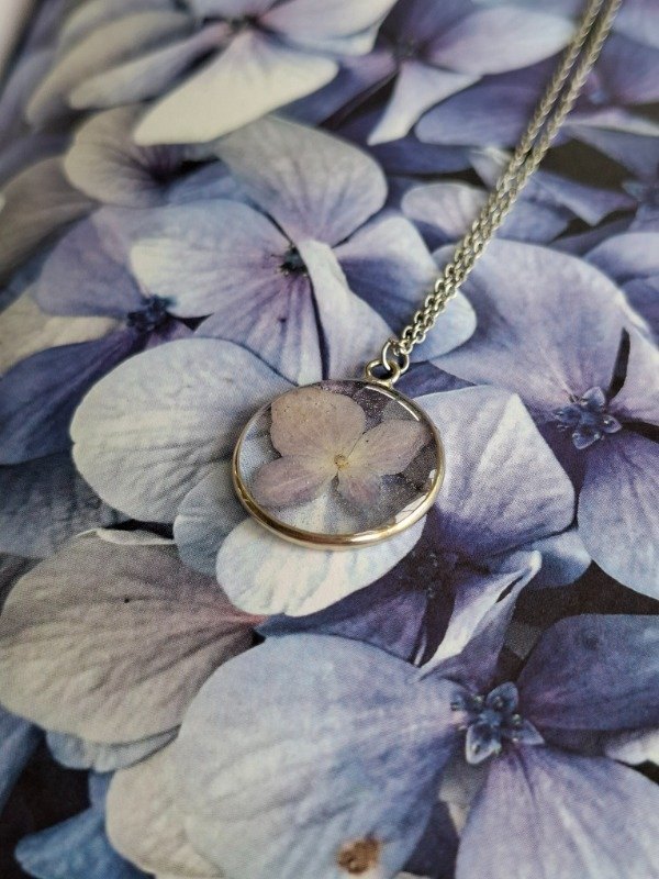 Este dije con una Hortensia lila es una auténtica joya realizada en alpaca, e incluye su cadena de acero quirúrgico y una bolsita para que te acompañe a donde vayas, aunque no lo lleves puesto :)