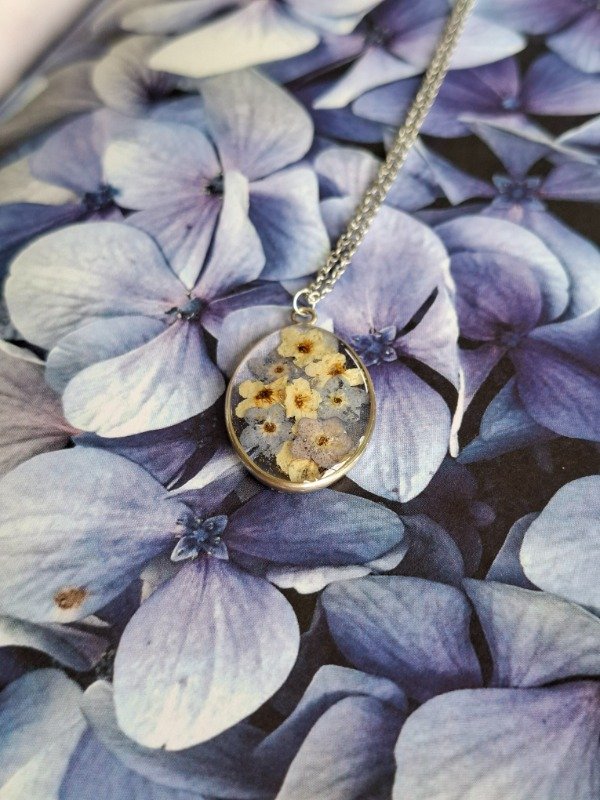 Este amuleto está elaborado con No me Olvides y Coronas de Novia;